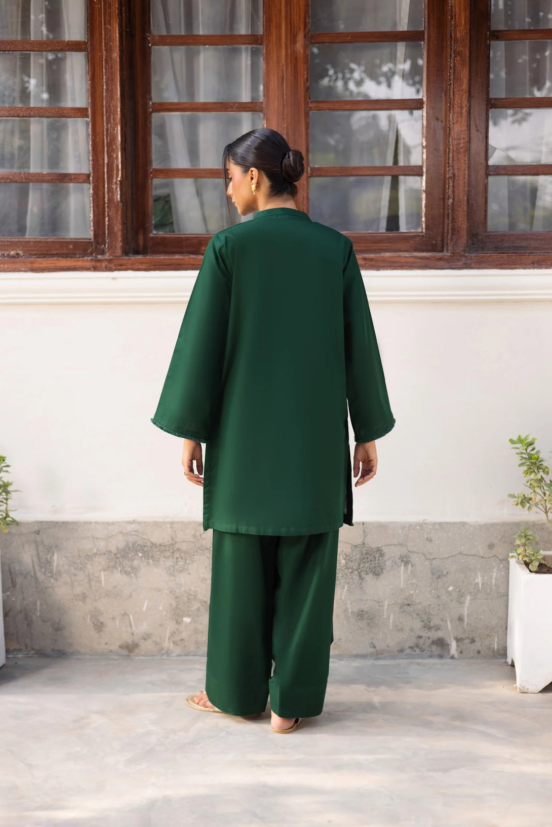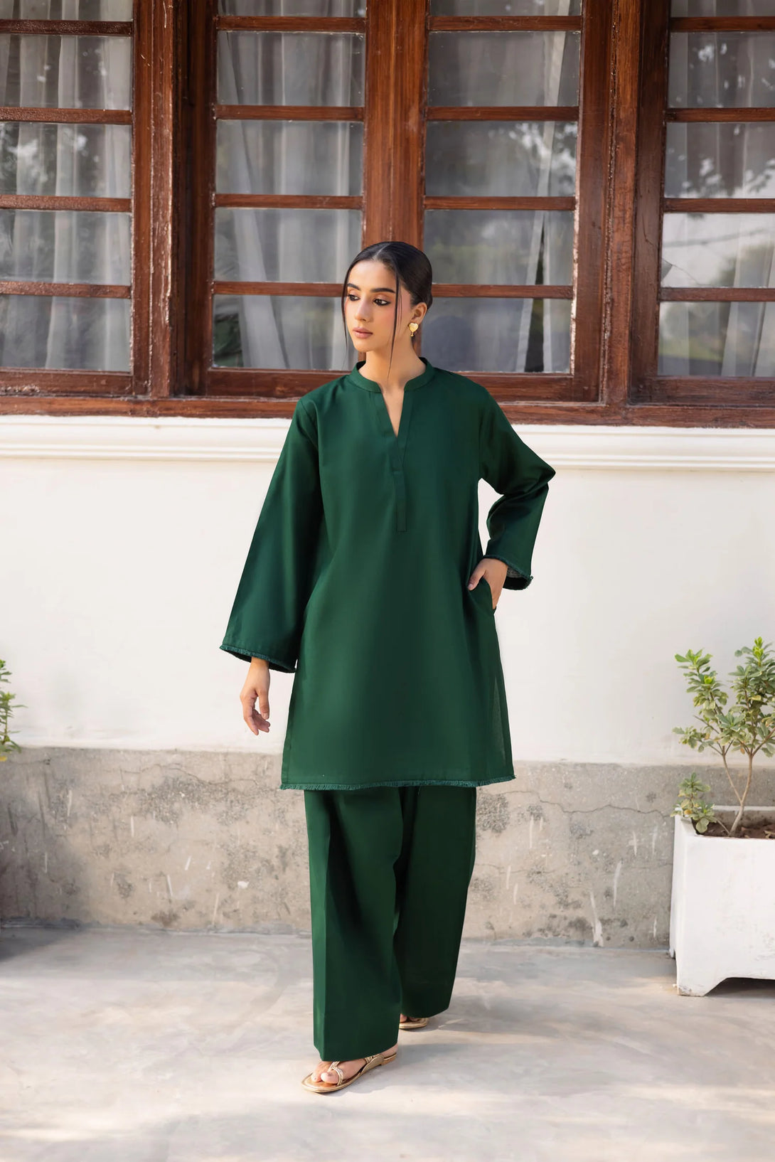 Step into winter with style and comfort in Bottle Green. Crafted from premium khaddar, this 2-piece solid outfit is warm, soft, and perfect for the season. The short shirt features delicate lace work on the border, adding a touch of elegance to its clean, minimal look. Paired with a flowy farshi shalwar, it creates a graceful and modern winter ensemble.