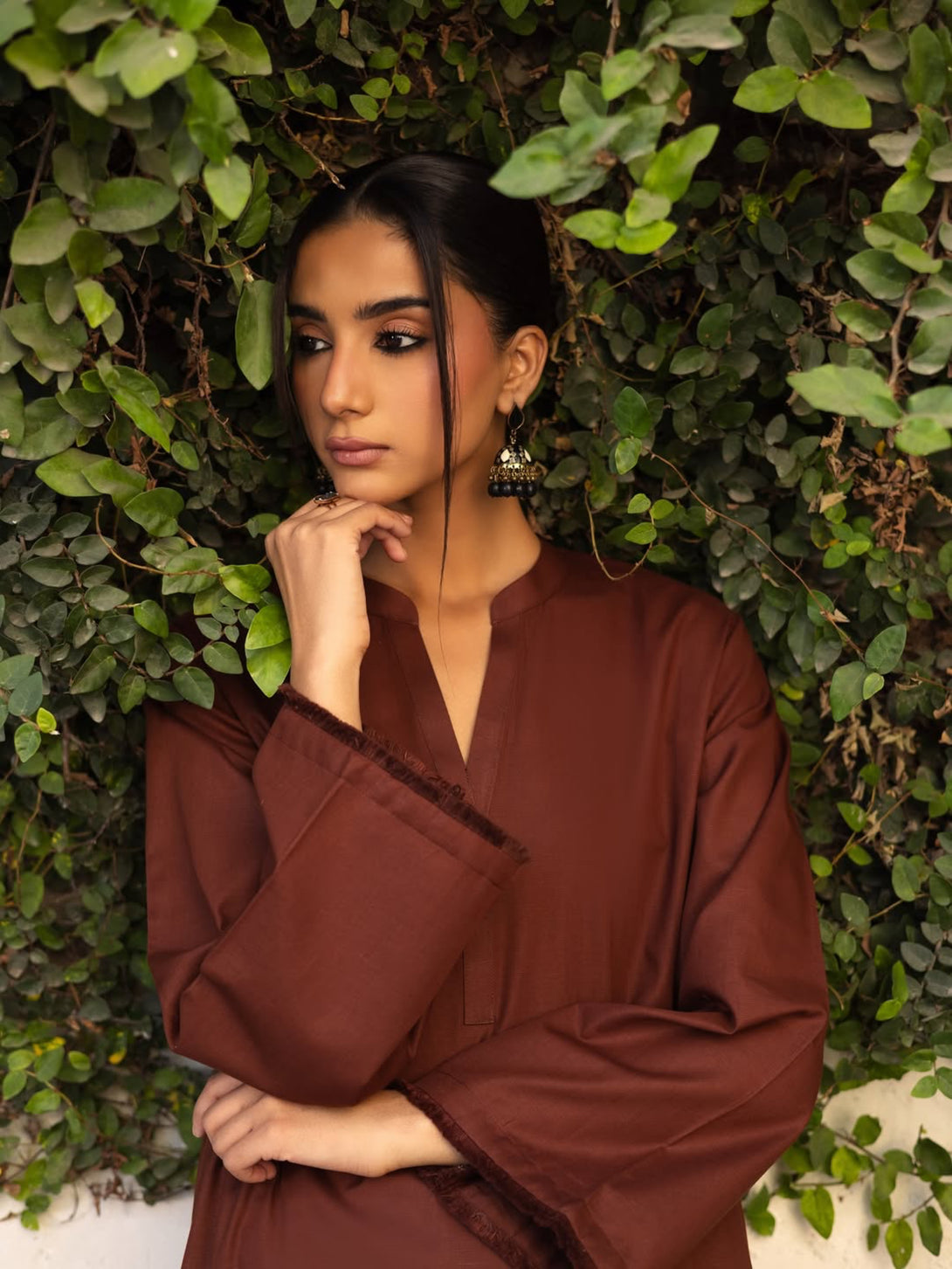 Step into winter with style and comfort in Brown Khaddar. Crafted from premium khaddar, this 2-piece solid outfit is warm, soft, and perfect for the season. The short shirt features delicate lace work on the border, adding a touch of elegance to its clean, minimal look. Paired with a flowy farshi shalwar, it creates a graceful and modern winter ensemble.