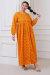 This beautiful stitched frock comes in a honey mustard shade with eye-catching printed details.