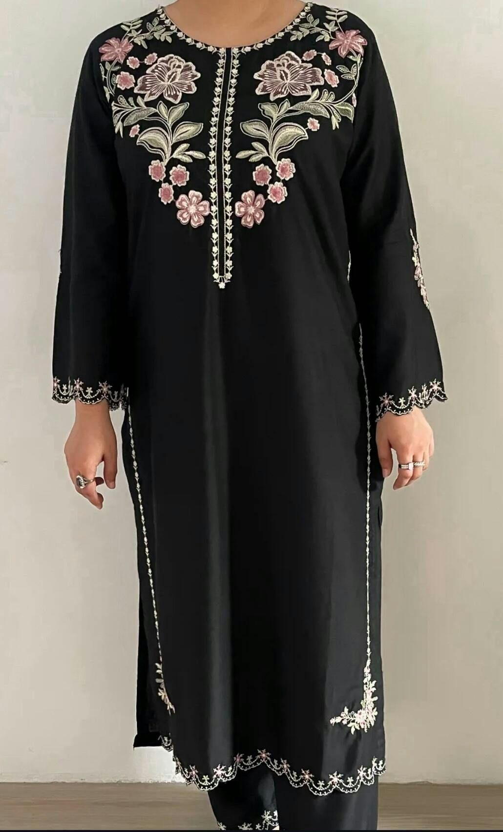 Make a bold and elegant winter statement with Liyaana. Crafted from warm winter cotton/Dhanak, this 2-piece outfit features intricate cutwork embroidery on the neckline, sleeves, and hem. The detailed floral work adds a premium, festive feel while keeping the outfit soft, cozy, and perfect for the season. Paired with matching embroidered trousers, it creates a complete and luxurious winter look.