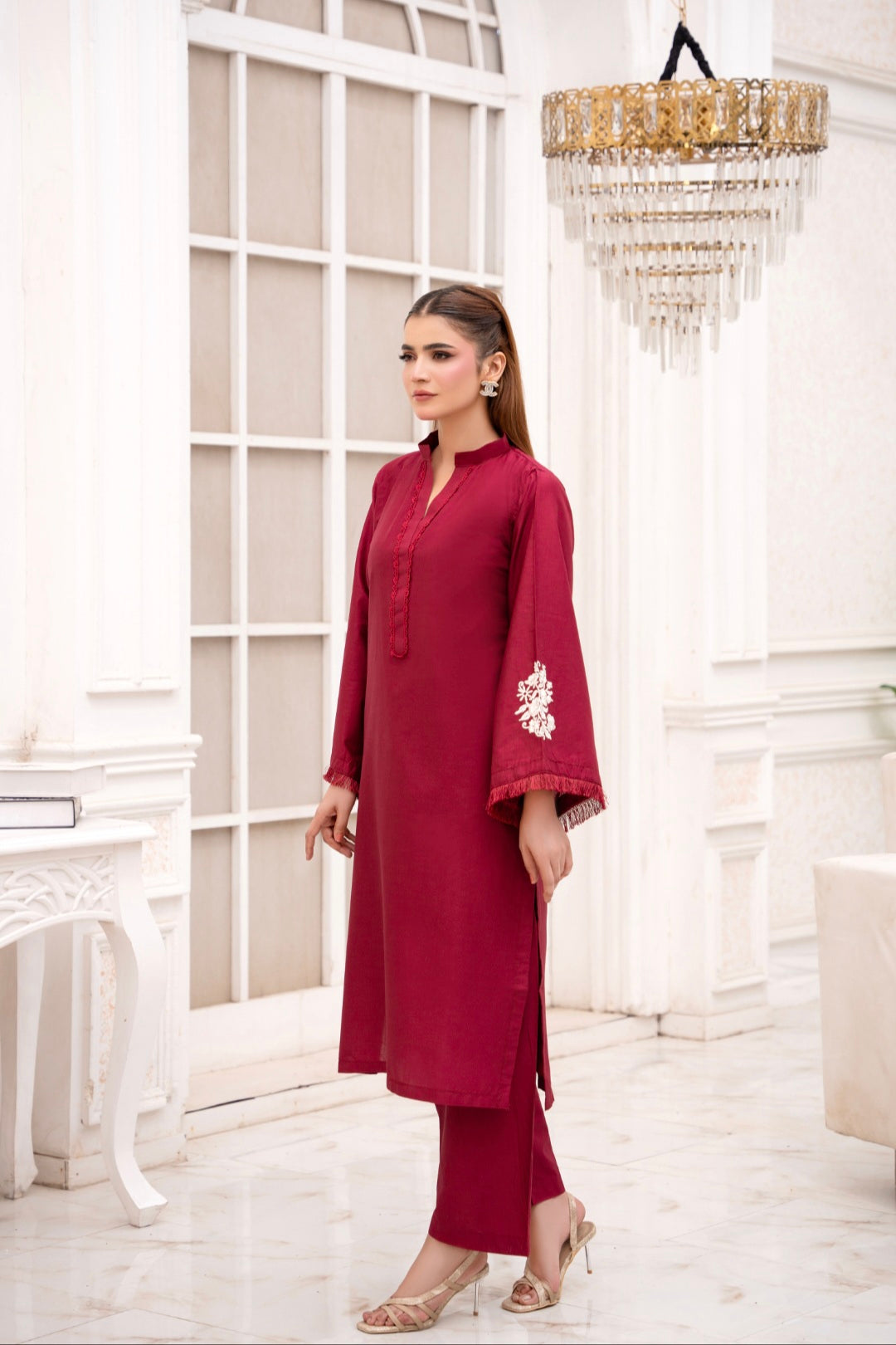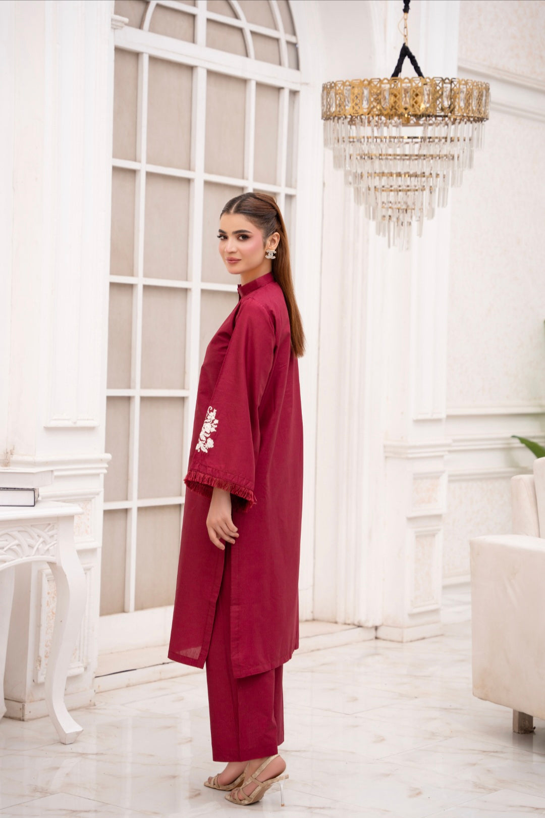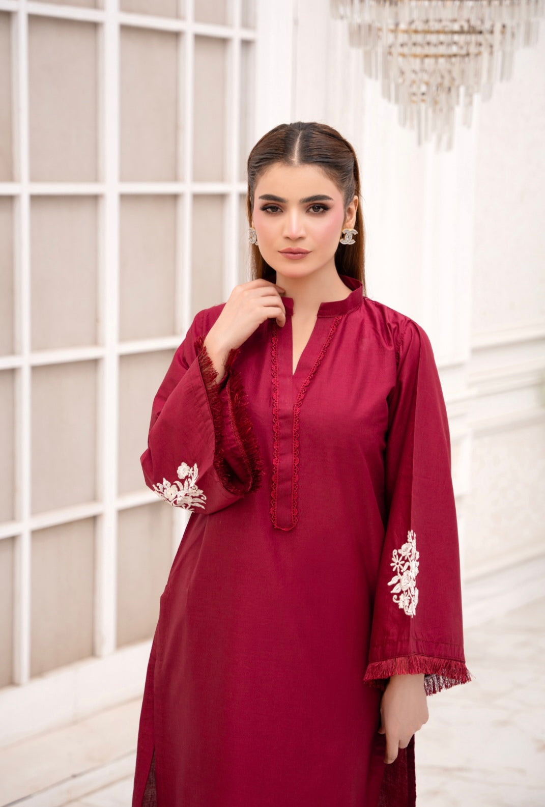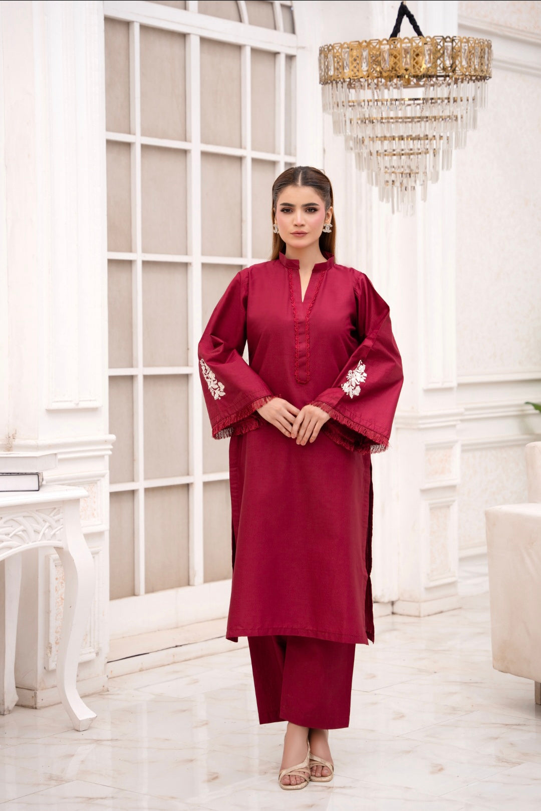 Stay stylish and cozy this winter withĀ Mehreen 2pc Crafted from soft cotton fabric in a deep red tone, features elegant white embroidery on the sleeves and a graceful front with unique cuff detailing. This 2-piece outfit perfectly combines comfort and charm ā ideal for winter days, casual outings, and cozy gatherings. ā¤ļø