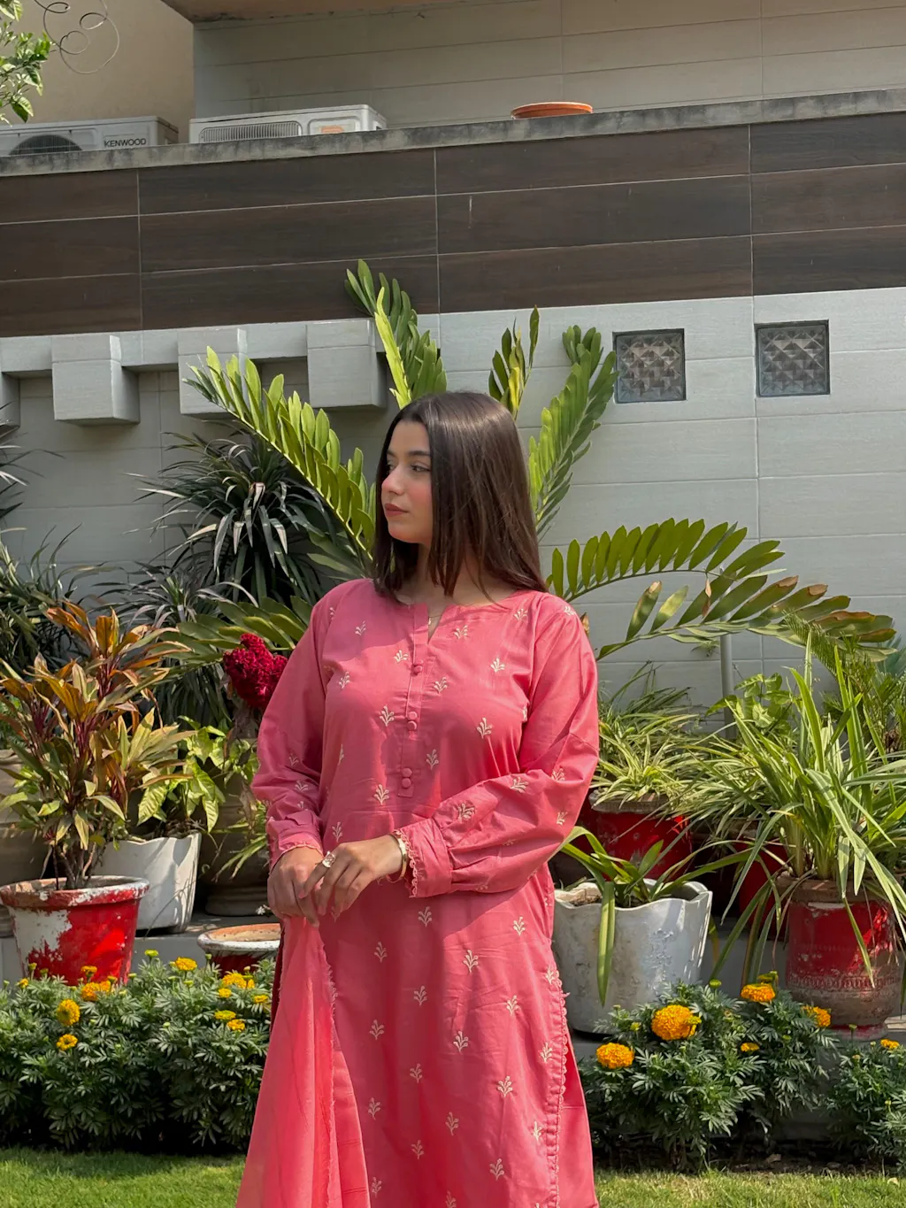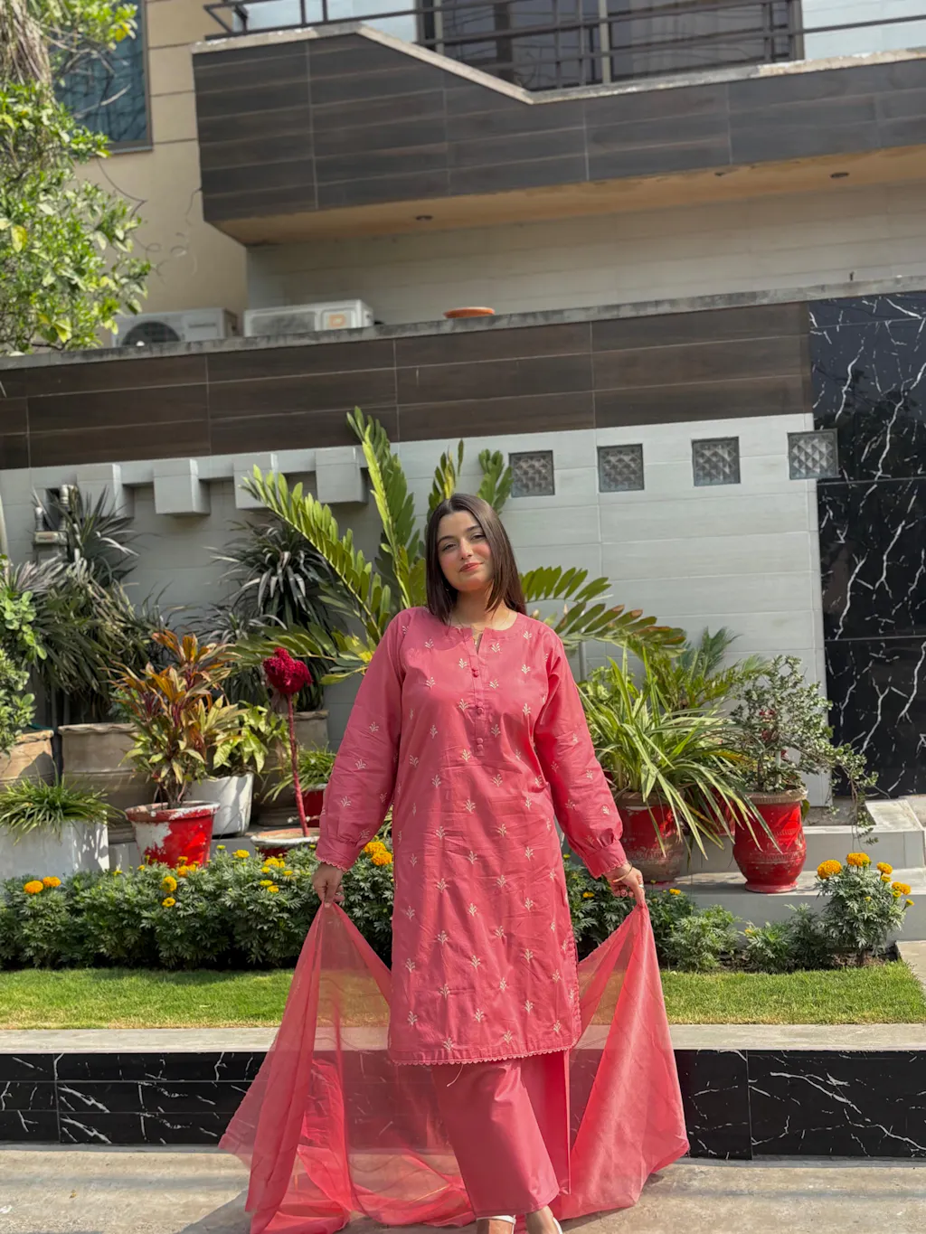 Introducing Mirhaa, a beautifully crafted 3-piece cotton suit designed for effortless grace and all-day comfort. Made from soft and breathable cotton, this ensemble is perfect for staying cool while embracing timeless elegance. The muted rose shirt is adorned with delicate embroidered motifs across the front and subtle detailing on the neckline and sleeves, adding a refined and feminine touch. Paired with a matching trouser and a lightweight dupatta, Mirhaa offers a complete and polished look. Ideal for daytime gatherings, casual meet-ups, and intimate festive moments — Mirhaa blends simplicity with understated charm.