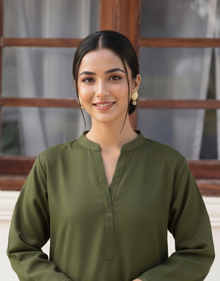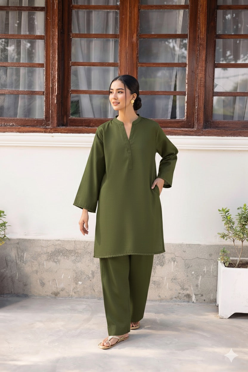 Step into winter with style and comfort in Olive Green. Crafted from premium khaddar, this 2-piece solid outfit is warm, soft, and perfect for the season. The short shirt features delicate lace work on the border, adding a touch of elegance to its clean, minimal look. Paired with a flowy farshi shalwar, it creates a graceful and modern winter ensemble.